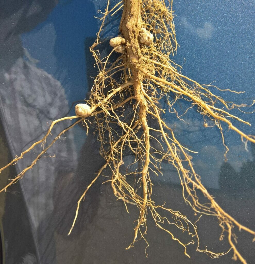 Podobne ako človek pri dýchaní, či ako aktivita pôdnych organizmov, aj rastlinné korene pri svojom raste uvoľňujú do pôdy CO2. Efekt je svojou podstatou rovnaký ako pri pôdnych mikroorganizmoch, teda čím intenzívnejší je rast koreňovej sústavy, tým vyššia produkcia CO2 – vyššia produkcia H2CO3 – intenzívnejšie prirodzené okysľovanie pôdy. Osobitnou kategóriou je pestovanie strukovín, u ktorých dochádza k fixácii vzdušného dusíka do pôdy. Proces fixácie vzdušného dusíka uvoľňuje do pôdy kyseliny. To je dôvod, prečo pri pestovaní strukovín dochádza k intenzívnejšiemu prirodzenému okysľovaniu pôdy ako pri pestovaní iných plodín.